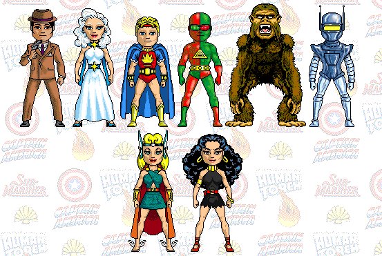 (*) Da esquerda para a direita, no desenho da cueca de Guy Gardner: Jimmy Woo, agente do FBI; Vênus; Marvel Boy; Homem-3D; Homem-Gorila; Robô Humano; Namora; Jann das Selvas.